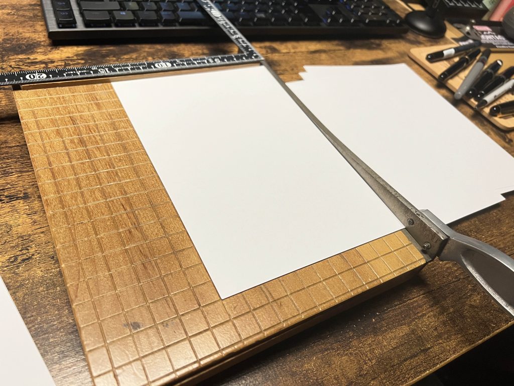 とりあえず、A4の画用紙をA5にカットしたよ。