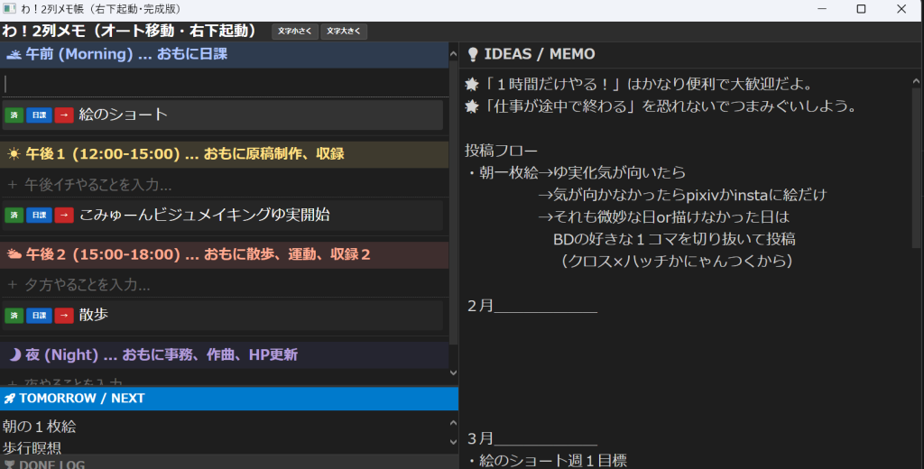 片付いた予定をDONEにしまったり、済んだ日課を明日に繰り越したり、先延ばしにすることを右に追いやったりできるようにした。